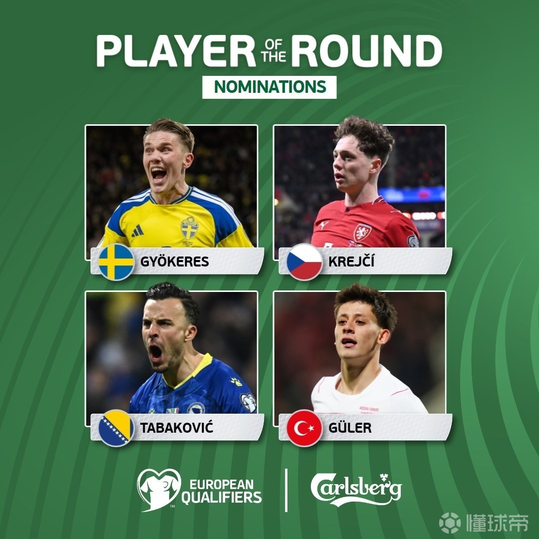 北京时间4月1日,世预赛欧洲区附加赛的四场决赛全部结束,瑞典、捷克、波黑以及土耳其分别获得了2026年美加墨世界杯决赛圈的参赛资格,与此同时欧足联官方也列出了本轮世预赛最佳球员的四位候选者。