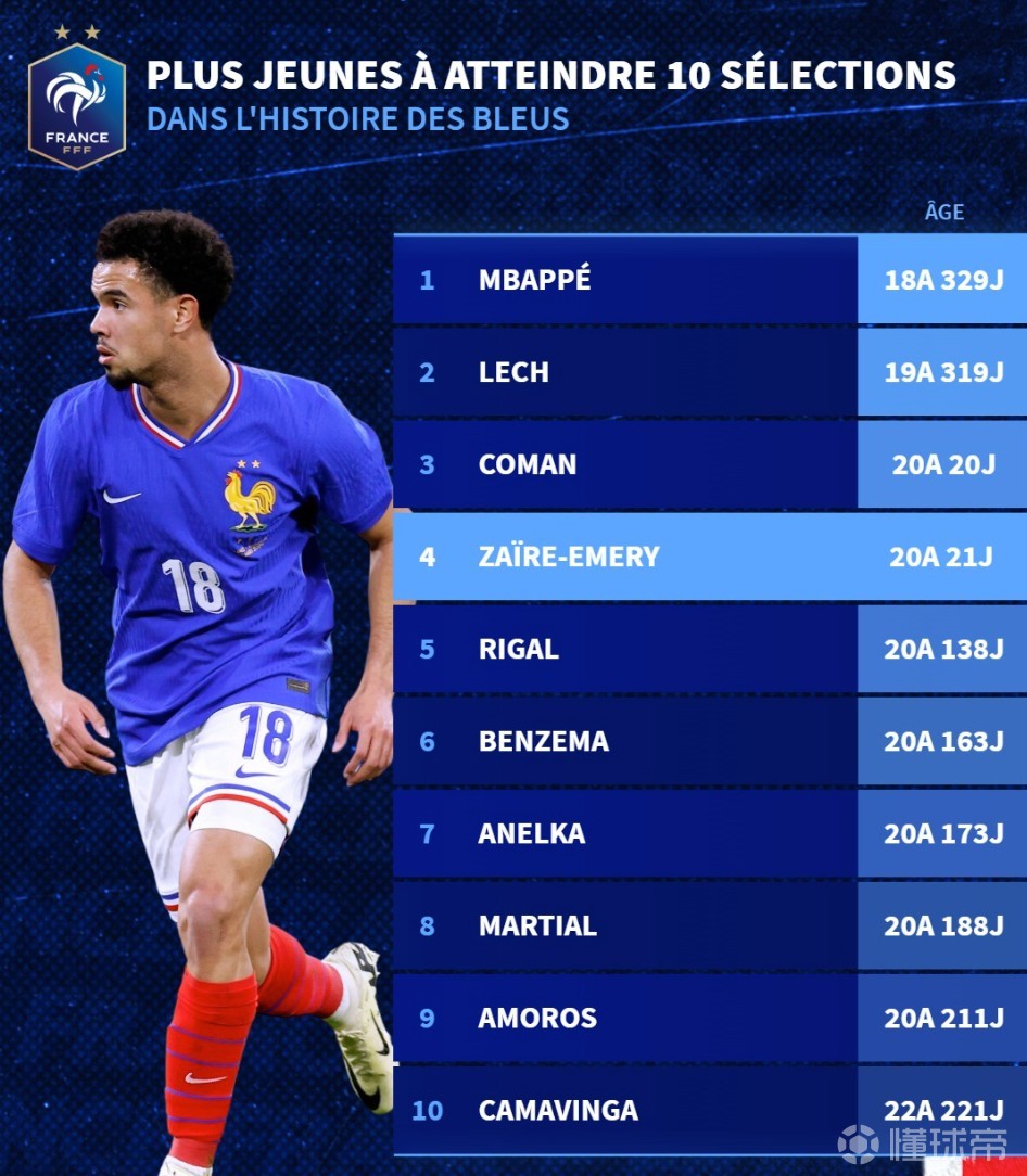 北京时间4月1日,根据德转的统计,巴黎圣日耳曼中场扎伊尔-埃梅里是代表法国国家队出场10次队史第四年轻的球员。