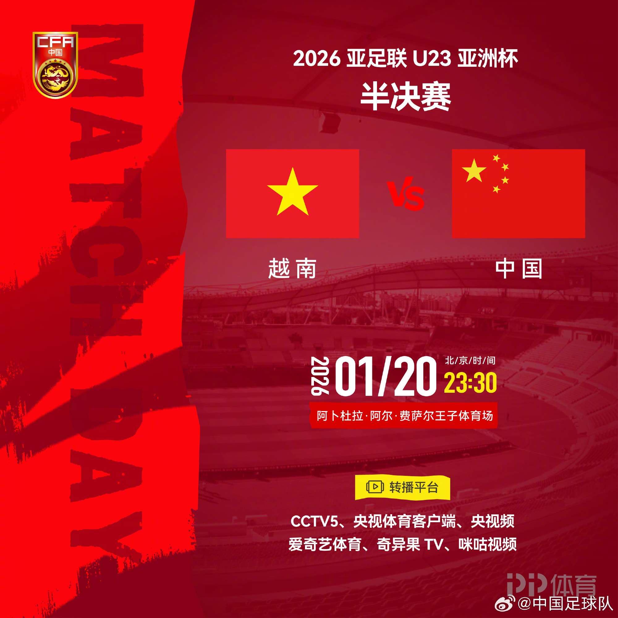 北京时间1月20日23:30,U23亚洲杯半决赛,中国U23将迎战越南U23,本场比赛在沙特阿卜杜拉-阿尔-费萨尔王子体育场举行。