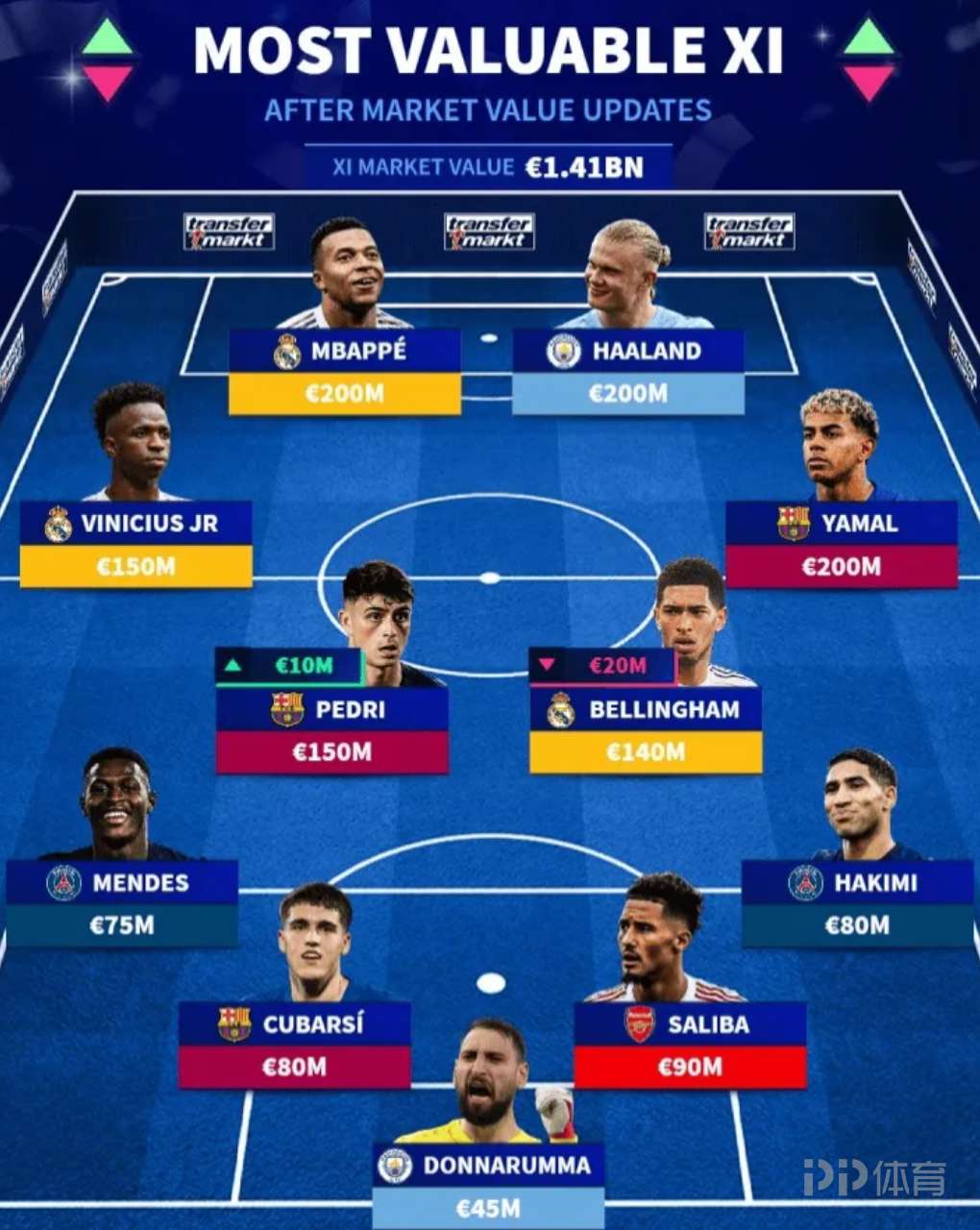 德国转会市场统计了世界足坛目前身价最高的阵容,该阵容的总身价达到了14.1亿欧元。