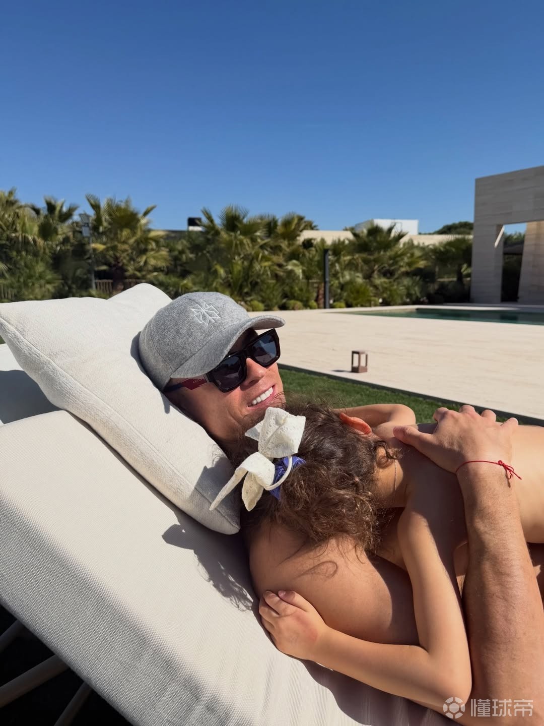 乔治娜在社交媒体上晒出一家人晒太阳度假的照片,可以看到,C罗与女儿躺在躺椅上,享受着日光浴,非常舒适。