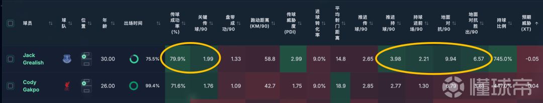 目前来看,格拉利什关键传球和传球成功率都更高,场均持球推进、地面对抗、过人都更高,加克波更高的是场均推进传球(高0.2次每场)。