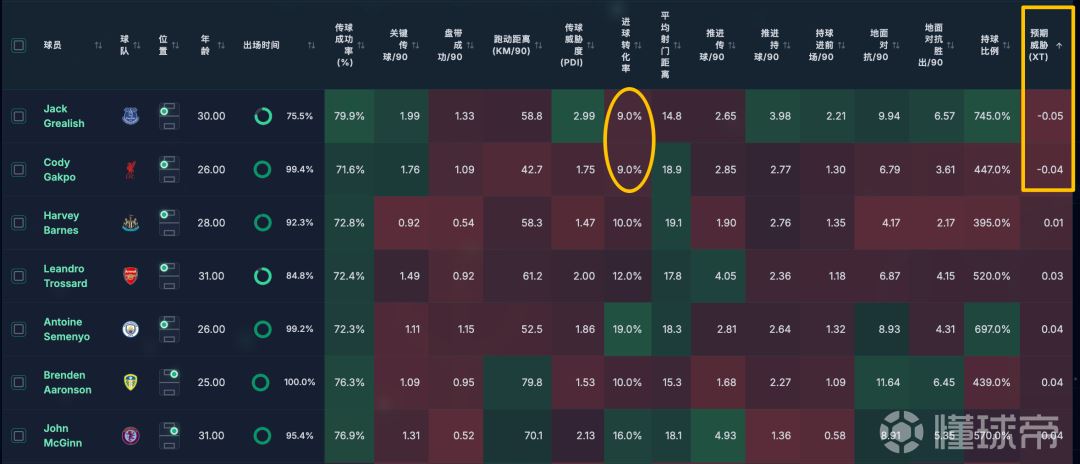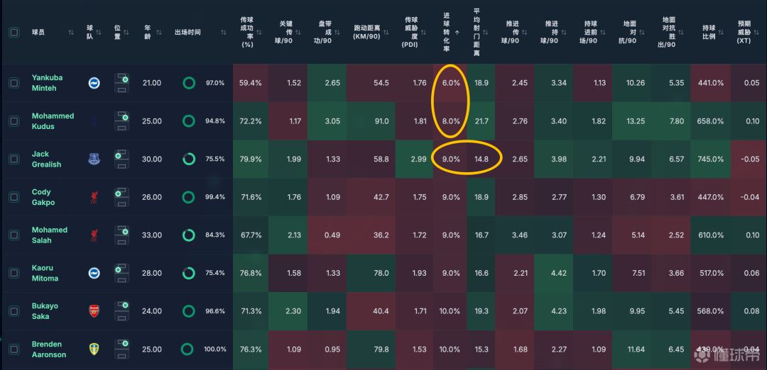 而库杜斯浪射紧随其后,格拉利什也挺拉的,因为他是这么多转化率低的边锋里,唯一一个平均射门距离最近的一个(14米)。