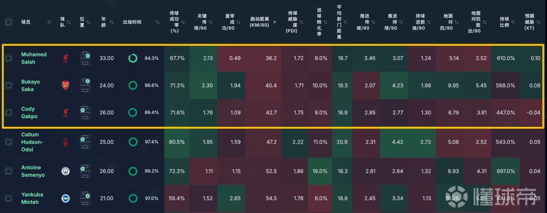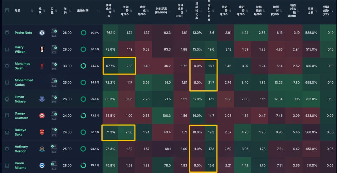 萨拉赫是在这群xT高的边锋里,平均射门距离最近的3个球员之一(另外三个是内托、萨卡),按照预期威胁来说,萨拉赫的9%以及萨卡的10%的进球转化率都非常低,严重影响到球队的得分效率。