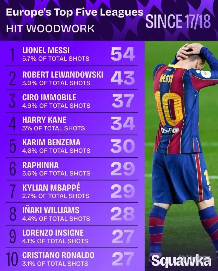 Squawka近日统计了2017-18赛季以来五大联赛球员射门中柱次数,其中梅西中柱54次排在第一,莱万以43次紧随其后。