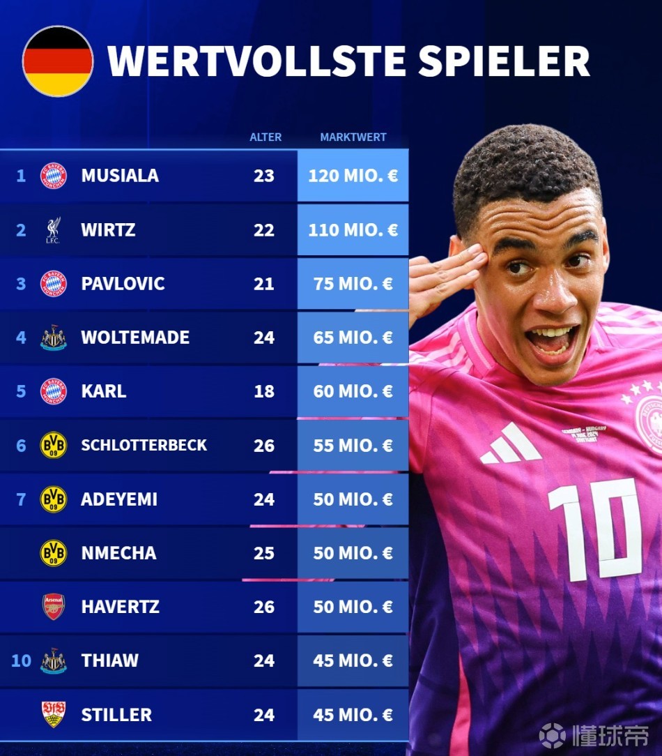 北京时间3月29日,在完成了欧洲五大联赛球员的身价更新之后,德转列出了德国球员身价前10,穆西亚拉1.2亿欧元第一,维尔茨1.1亿欧元第二。