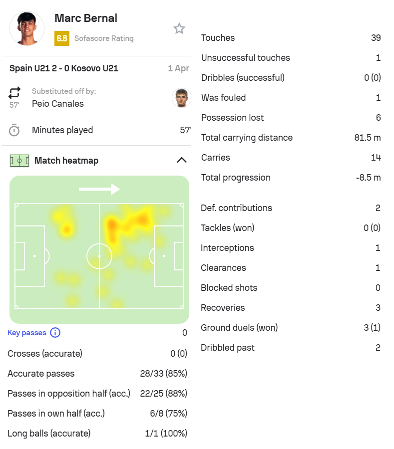 这是贝尔纳尔第2次为西班牙U21出场。