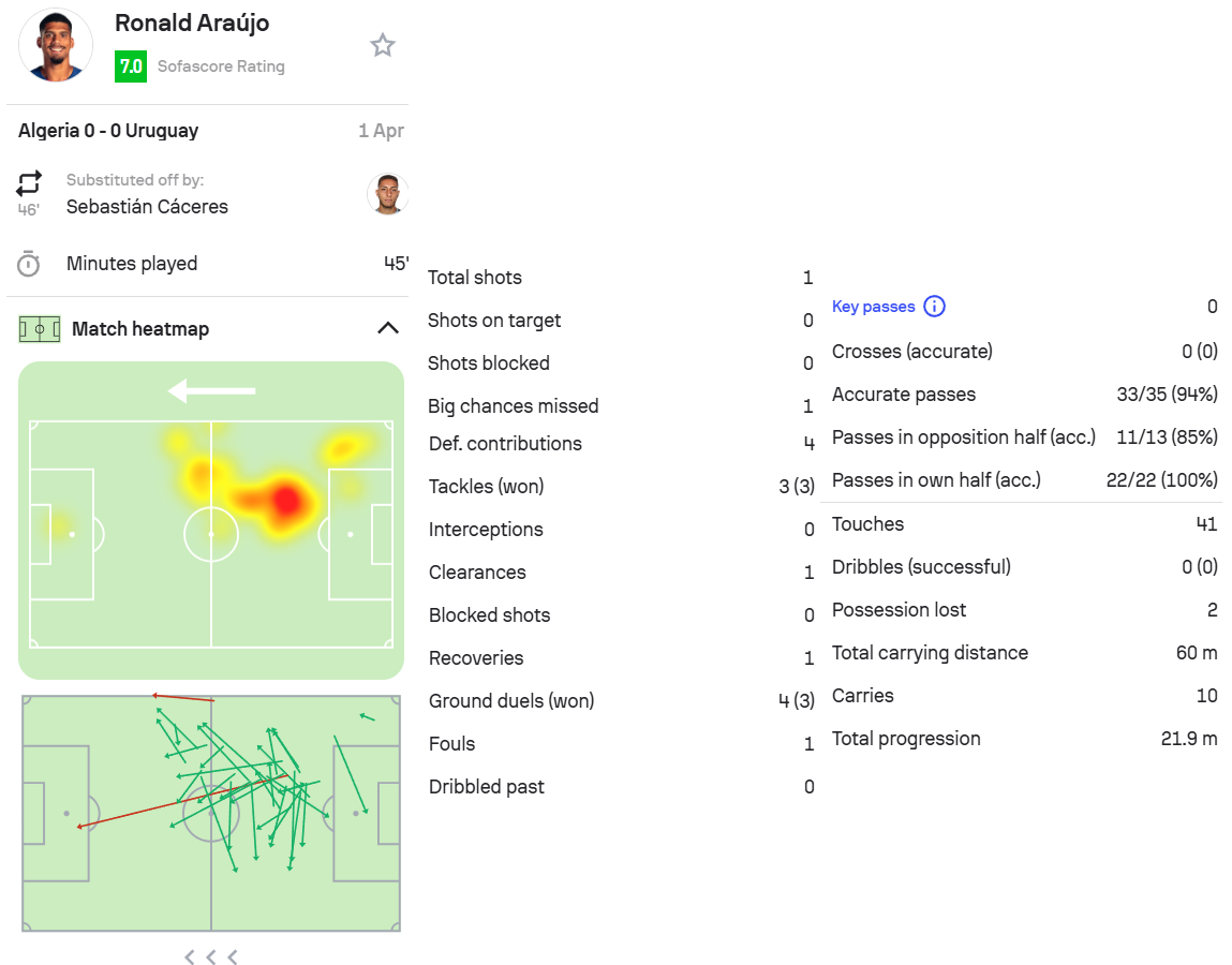 8.阿劳霍,阿尔及利亚0-0乌拉圭,首发出场45分钟。