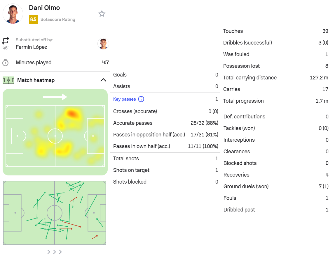 奥尔莫本场比赛1次射门并射正,3次盘带均未成功。