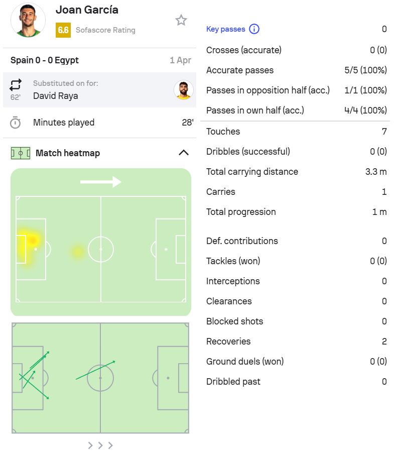 7.霍安,西班牙0-0埃及,第62分钟替补出场,零封。