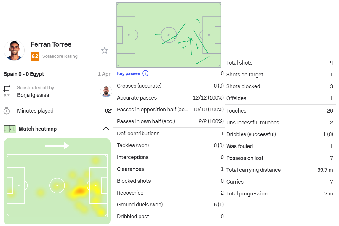 1.费兰,西班牙0-0埃及,首发出场62分钟。