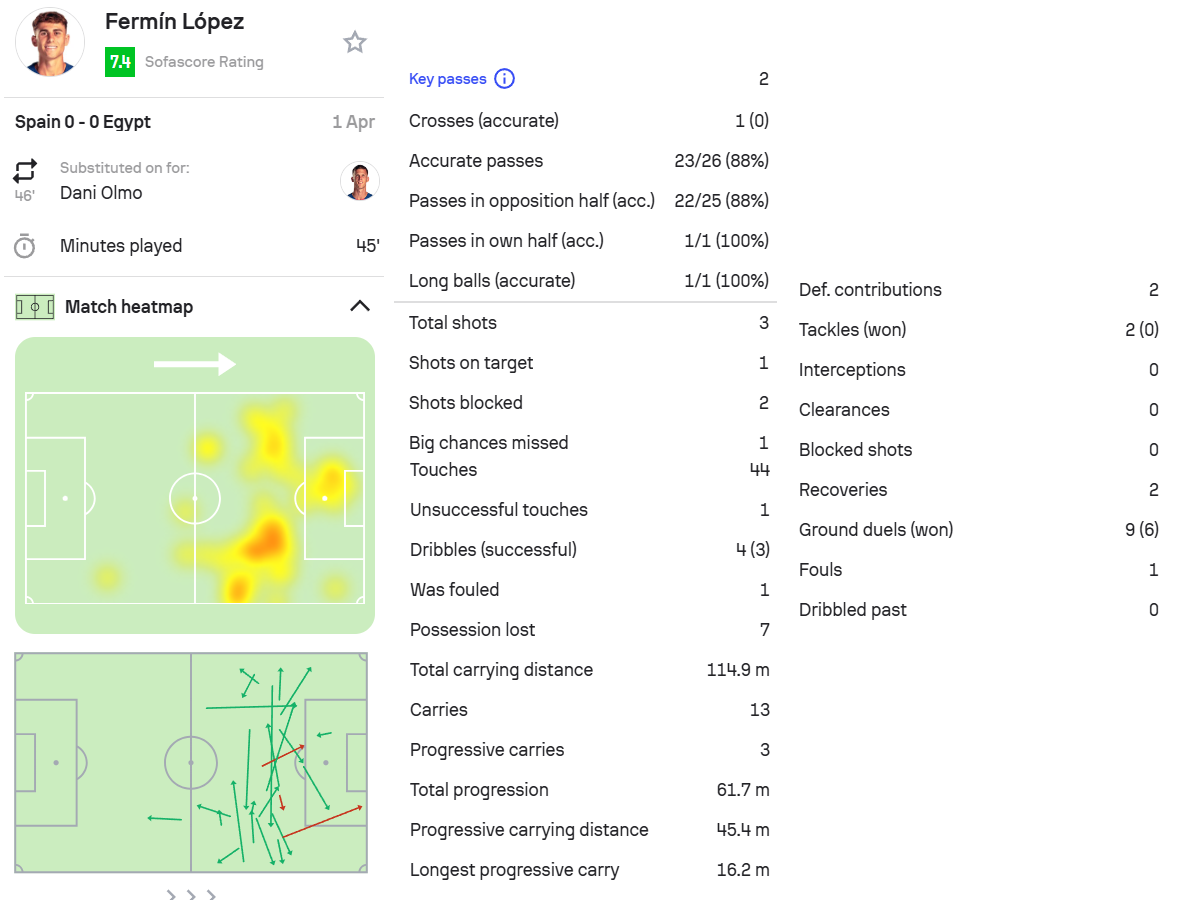 3.费尔明,西班牙0-0埃及,第46分钟替补出场。