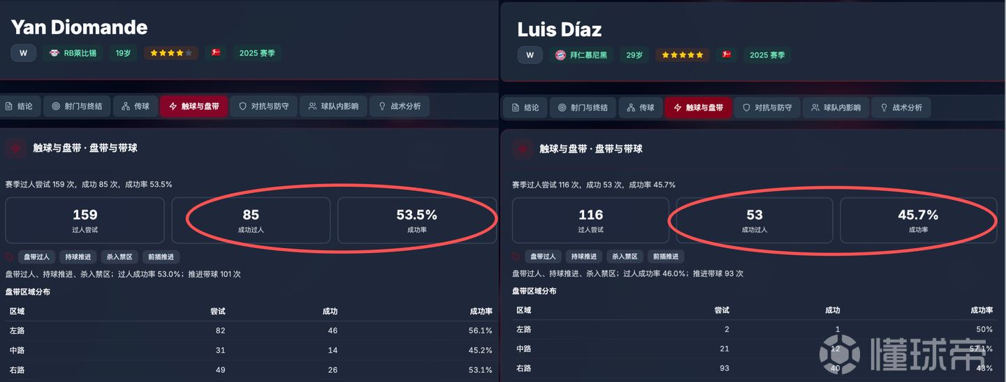 无论是盘带尝试、成功、还是成功率,迪奥曼德都更高,这是因为他身体的灵活性、柔韧性,走变向的带球方式刷出来的。