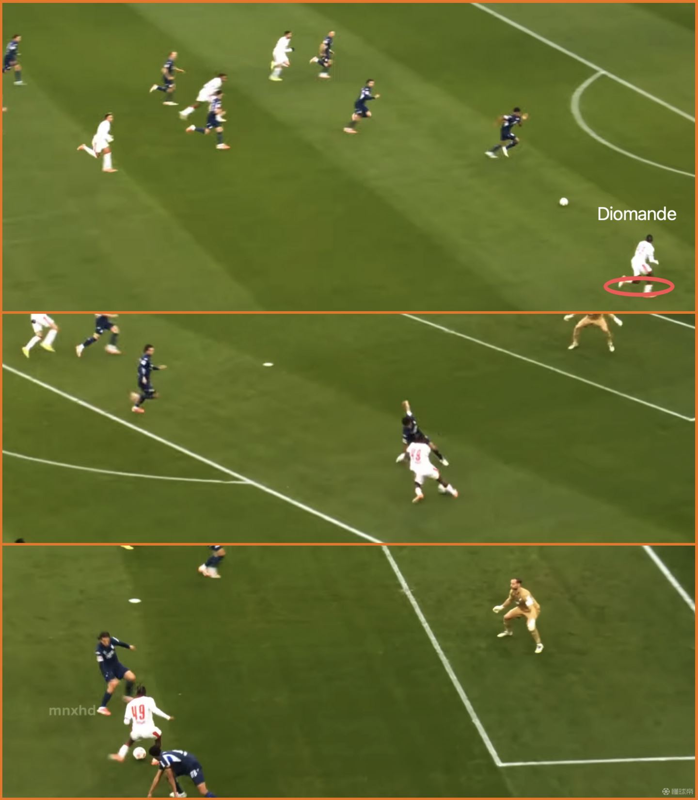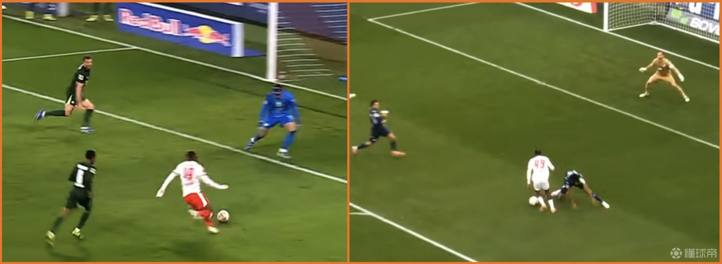 当然,这也是受限于RB Leipzig的踢法,更多是走地面层层推进,使得纵深不太有大步流星的空间(当然,即便有大步流星的空间,我看到的迪奥曼德在高速的人球结合上还是不可避免因为想更稳妥地控球,而选择降速)