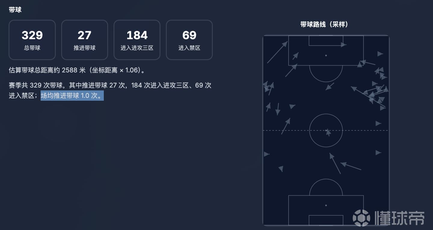 以及,其高速人球结合当中会稍微有点不自信,习惯主动降速来进行更精细化地控球,长距离推进是短板。
