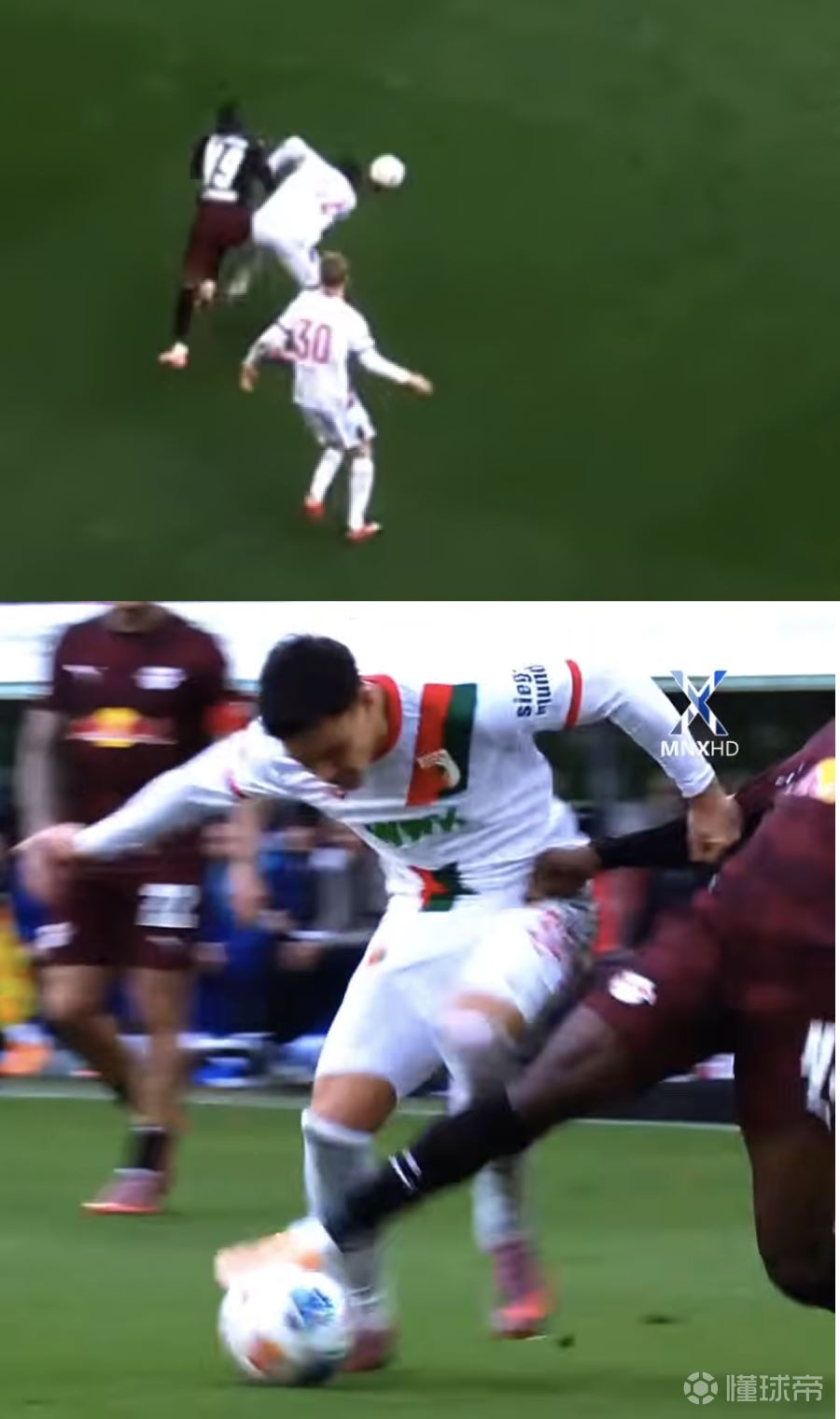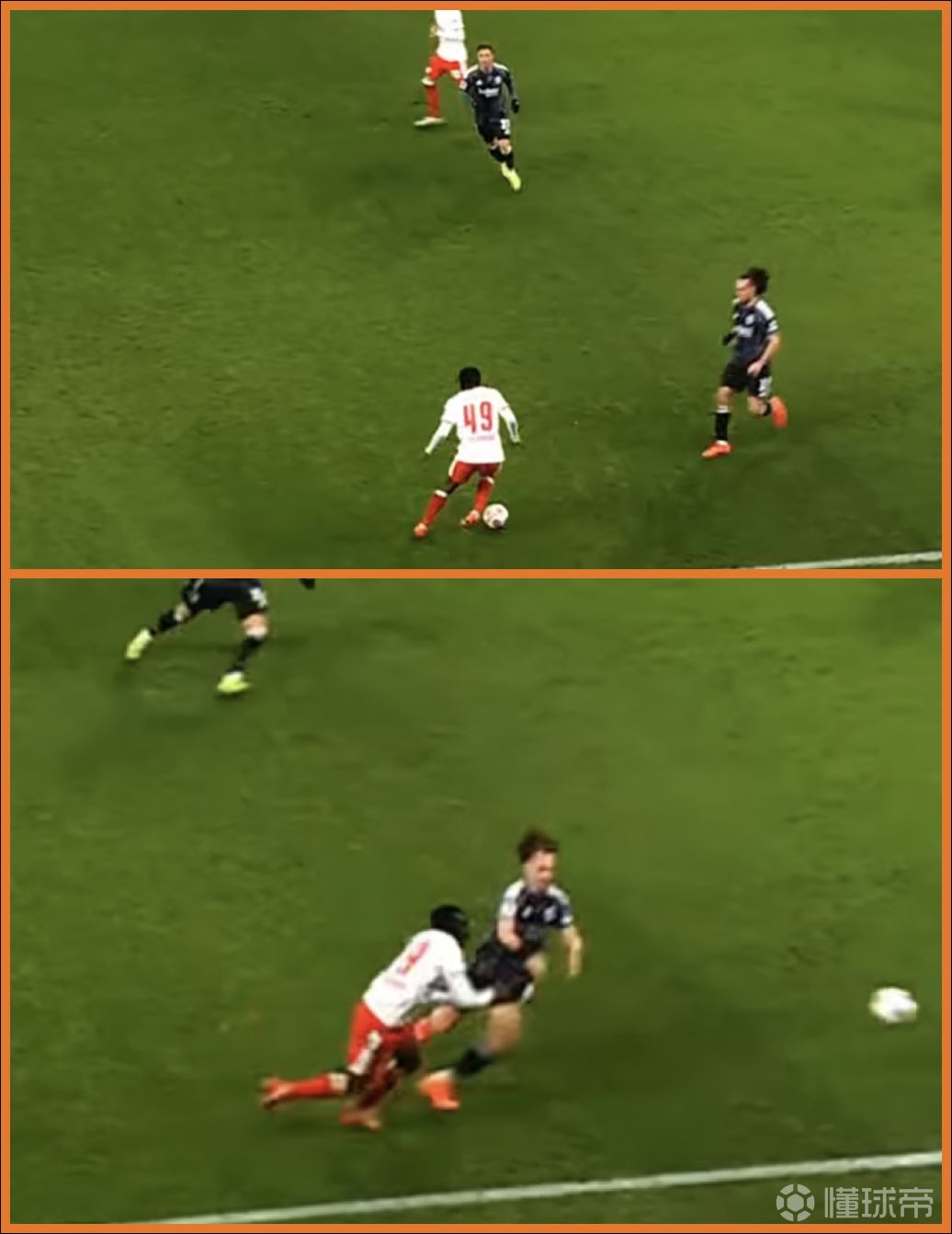 我上文也提到了,他并不是一个在高速持球推进当中去过人的球员,他更喜欢静态启动,而因为其身体柔韧性和平衡性,在对抗当中即便他不处于优势身位,他也能把球摘出来:(图中深色49号为迪奥曼德)
