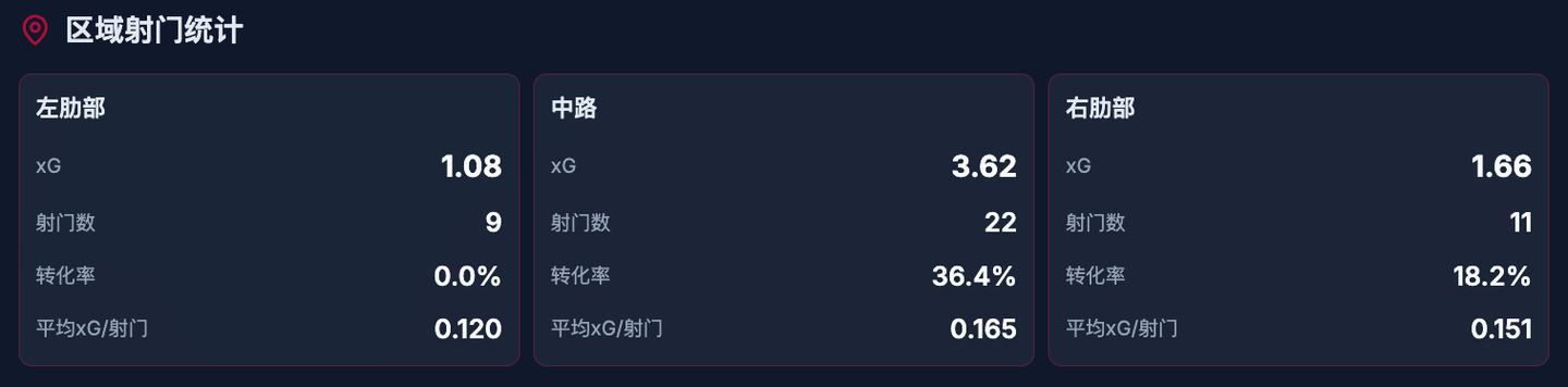 而在进球区域里,来自中路和右肋部的射门转化率奇高。