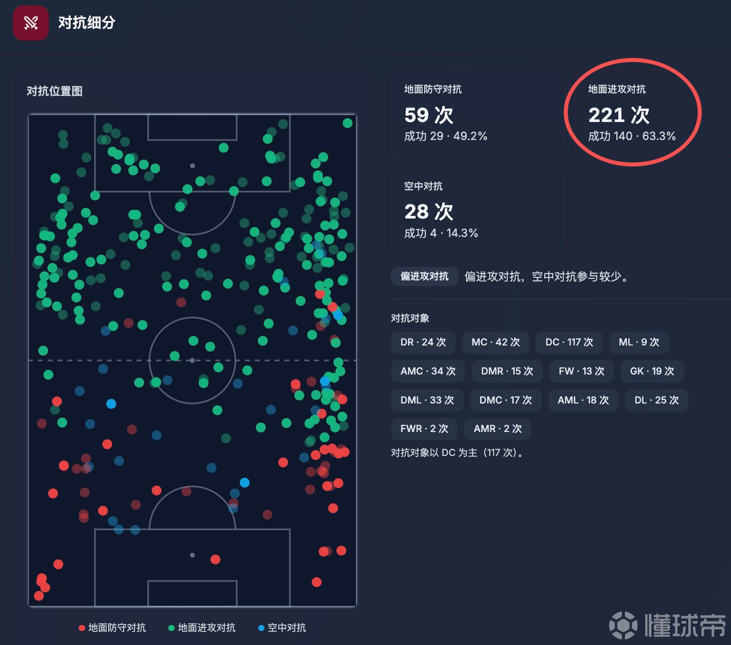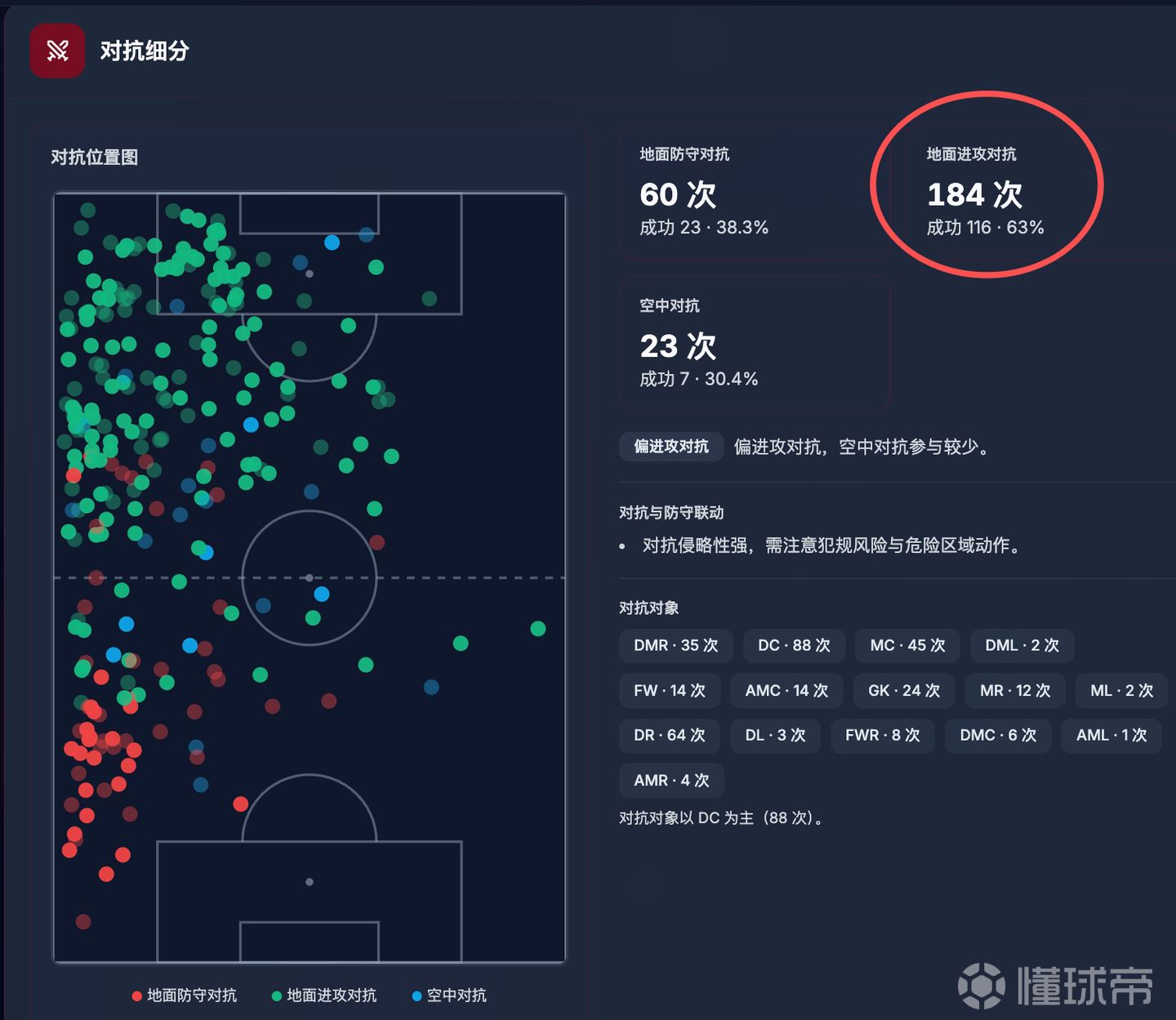 他的进攻地面对抗成功率高达63%,这在德甲是相当超标的。