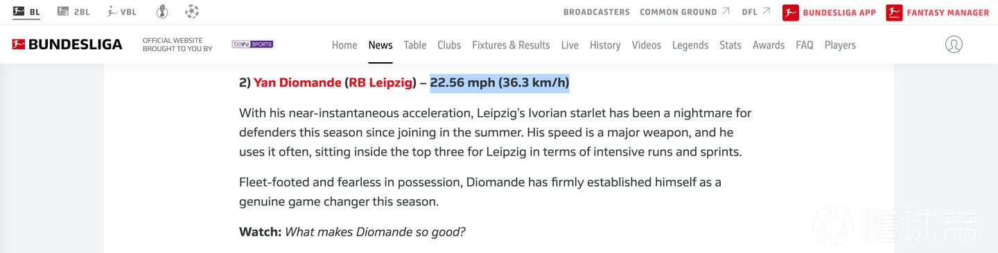 第二个则是推进,虽然迪奥曼德的极限冲刺最高的瞬时速度虽然在德甲官方统计出来的是36.3km/h: