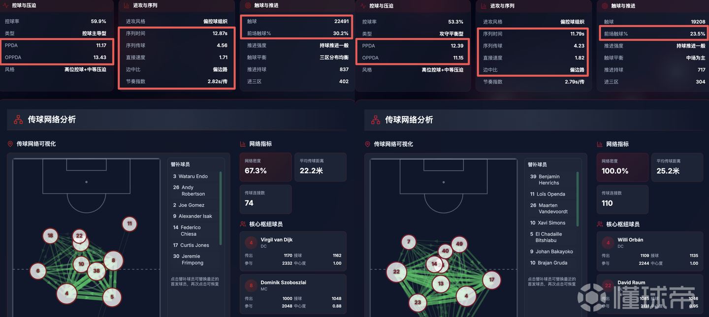 左边是利物浦,右边是莱比锡,二者在结构设计思路上是有相似的,但是问题就在于,利物浦现在的OPPDA(控球状态下对方平均每次防守,本方的传球次数,这个越高越好)出问题了(即控不住球,拿住球了之后容易丢球权),以及在进攻序列时间里太慢。