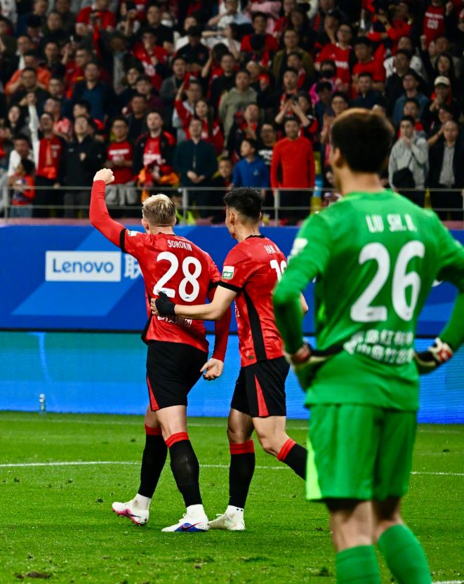 比赛的第40分钟,罗慕洛禁区前远射,刘世博扑球脱手,索罗金补射破门,打入了成都蓉城处子球。