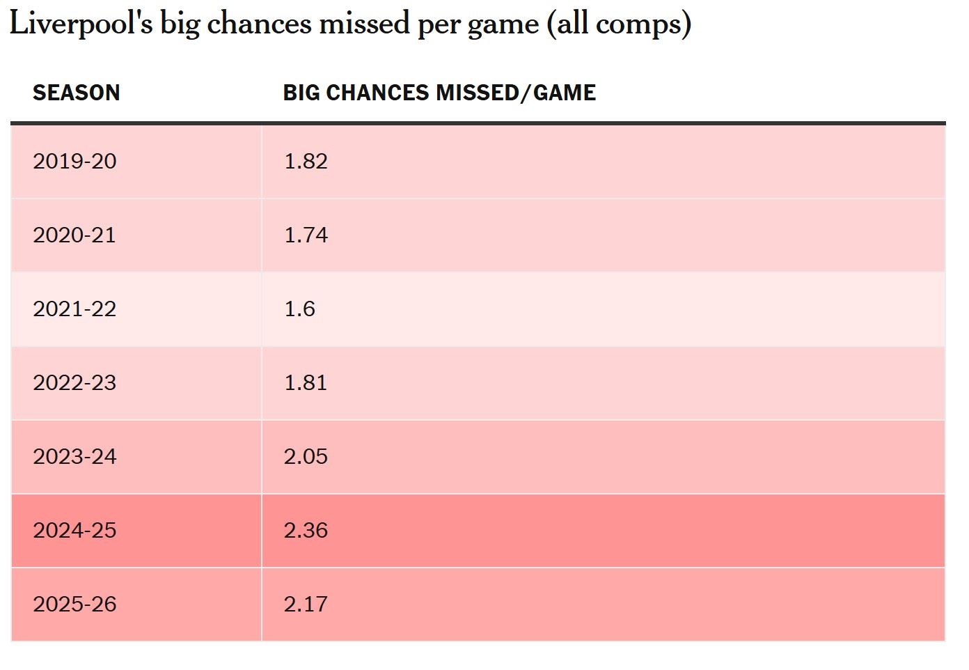 那么利物浦在门前的表现是越来越差了吗?