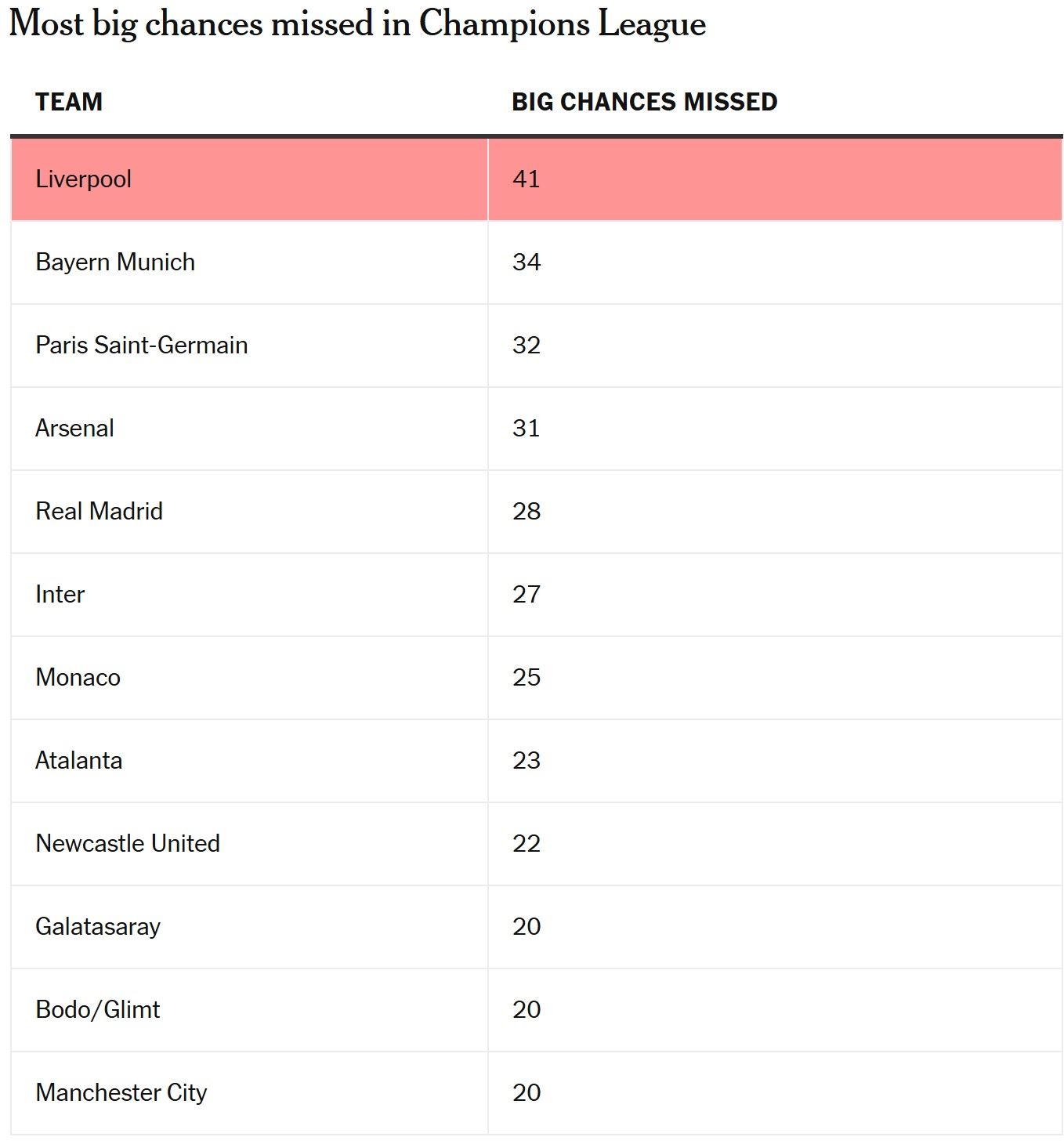 简单来说,本赛季英超只有三支球队——曼城、曼联和阿森纳——错过的重大机会比利物浦更多。从某种程度上说,这并不奇怪:创造的机会越多,错过的可能性就越大,而且这项数据的高位区被积分榜前列的球队所占据。但利物浦在错失重大机会的百分比上也排名第三差(32.9%)。