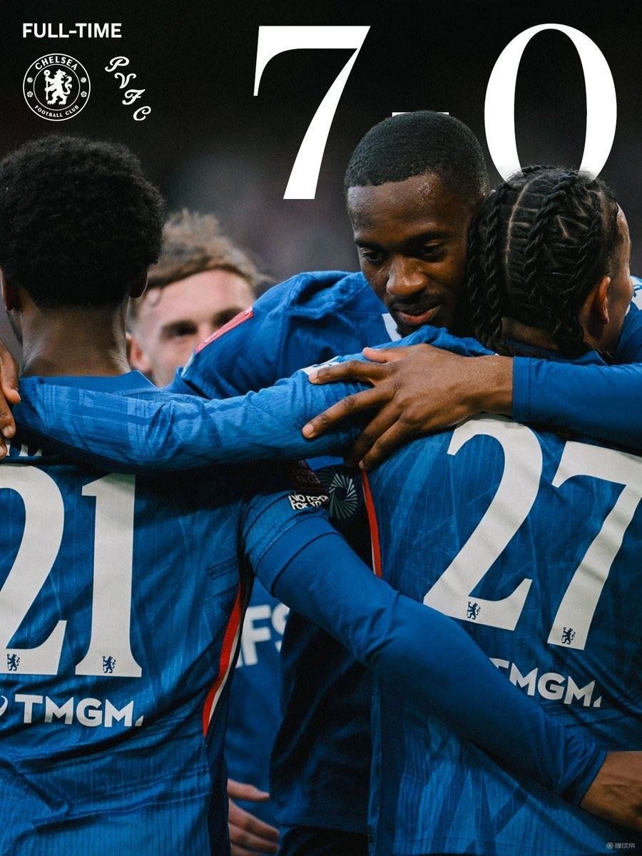 此役主场对阵维尔港,上半场战罢取得3-0领先的切尔西在下半场再入四球,最终以7-0的比分大胜对手。