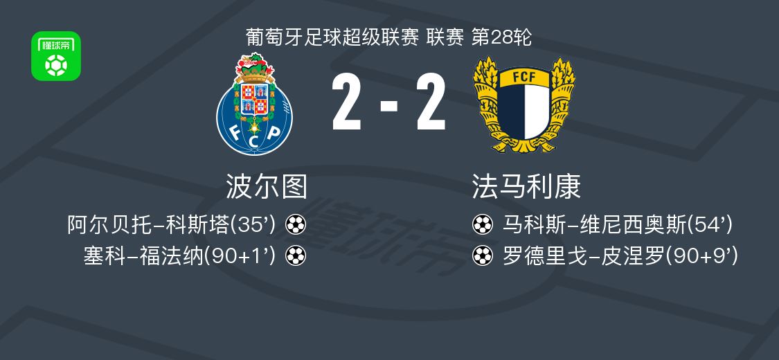 北京时间4月5日葡萄牙足球超级联赛 联赛 第28轮,波尔图主场对阵法马利康。波尔图阿尔贝托-科斯塔破门,塞科-福法纳破门。法马利康马科斯-维尼西奥斯破门,罗德里戈-皮涅罗破门。最终比分波尔图 2-2 法马利康。