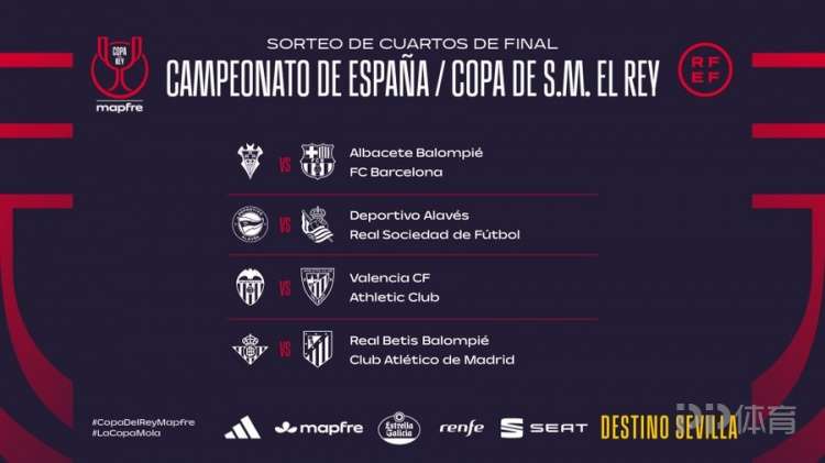 国王杯1/4决赛抽签结果出炉,阿尔瓦塞特对阵巴萨,贝蒂斯对阵马竞。比赛将于当地时间2月3日、4日和5日举行。