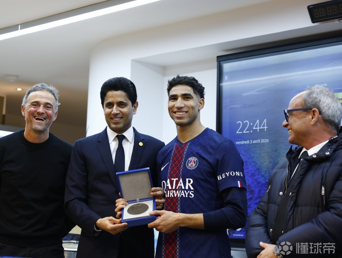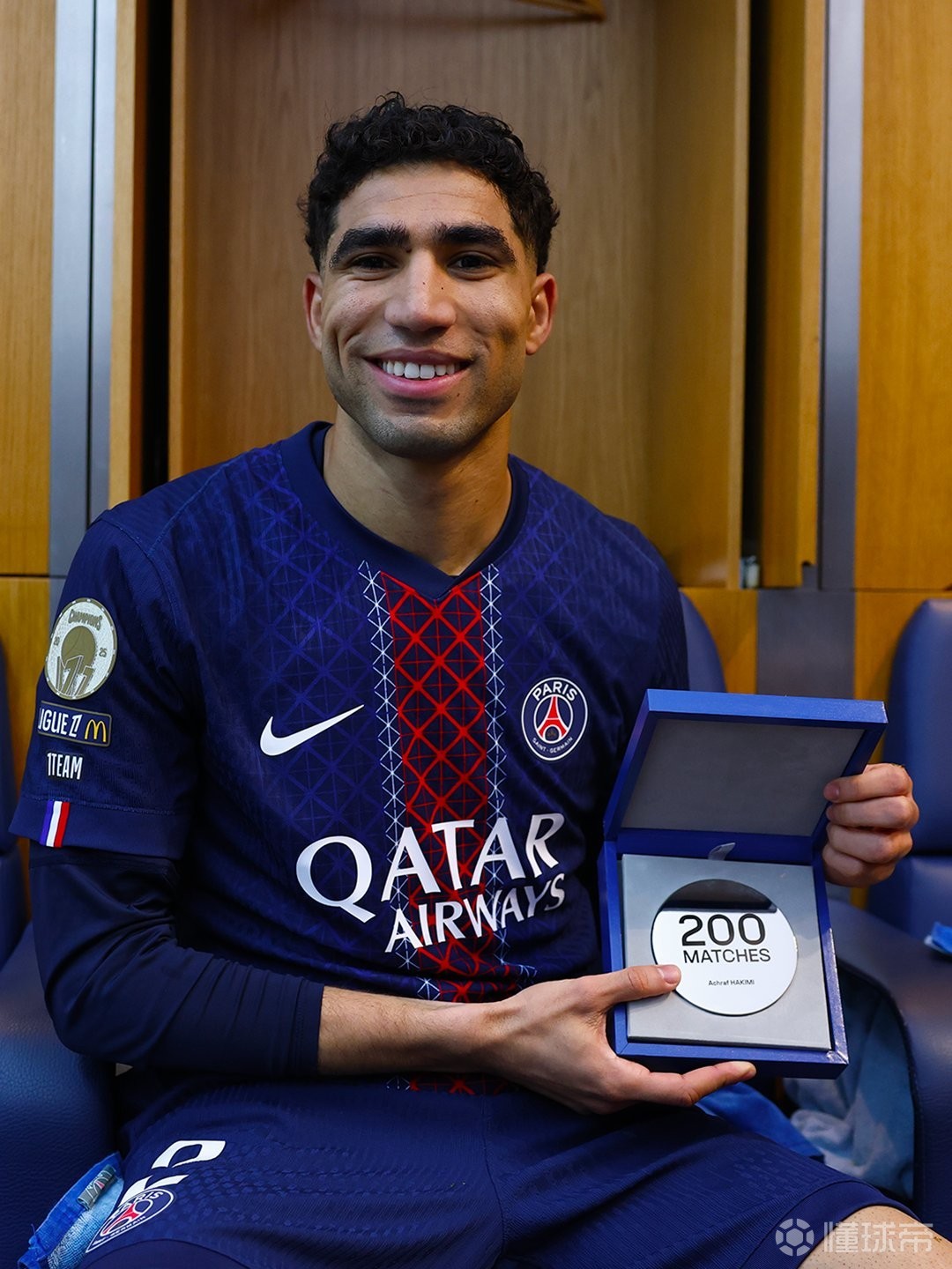 北京时间4月4日,在完成自己代表巴黎圣日耳曼出战200场正式比赛的里程碑之后,阿什拉夫收到了俱乐部赠予的纪念奖牌。