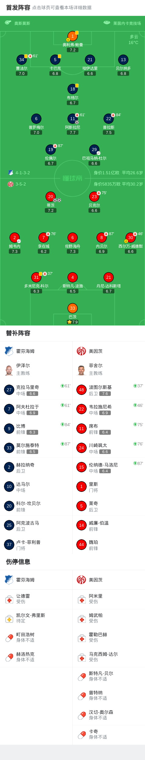 北京时间4月4日德国足球顶级联赛 联赛 第28轮,霍芬海姆主场对阵美因茨。霍芬海姆阿斯拉尼破门。美因茨蒂茨梅开二度。最终比分霍芬海姆 1-2 美因茨。