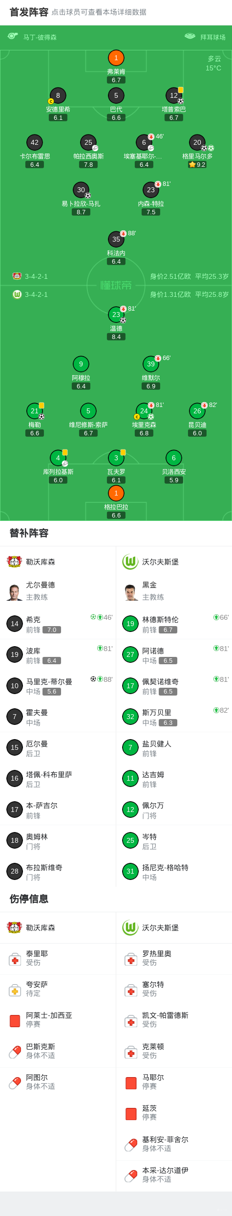 第73分钟,易卜拉欣-马扎推射得分,勒沃库森5-3沃尔夫斯堡