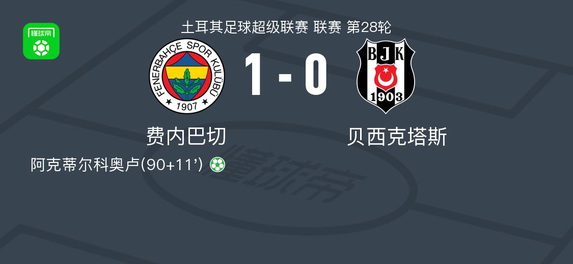 北京时间4月6日土耳其足球超级联赛 联赛 第28轮,费内巴切主场对阵贝西克塔斯。费内巴切阿克蒂尔科奥卢破门。最终比分费内巴切 1-0 贝西克塔斯。