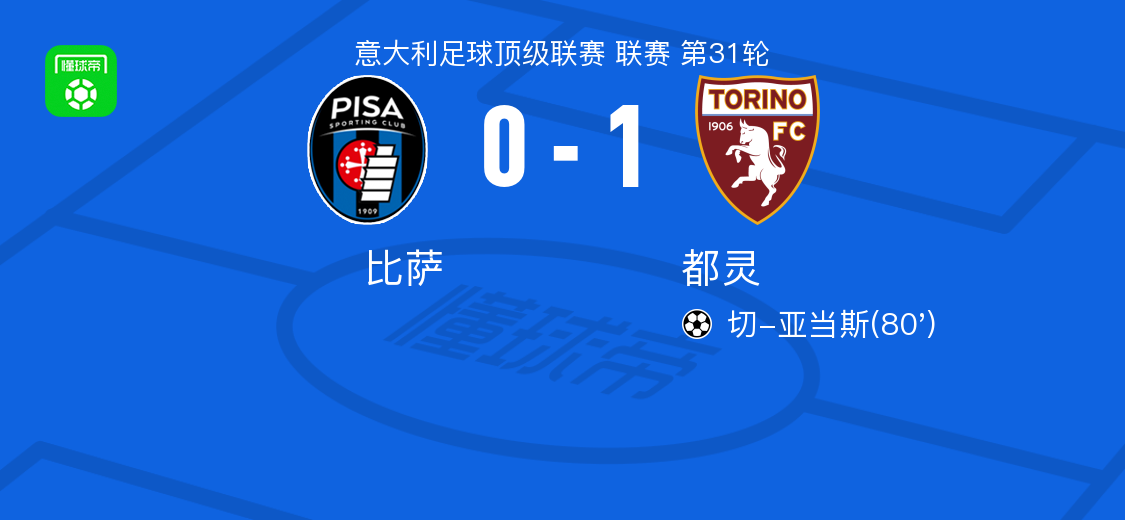 北京时间4月6日意大利足球甲级联赛第31轮,比萨主场对阵都灵。比赛过程中,都灵球员完成一次助攻,切-亚当斯打入全场唯一进球。最终比分比萨0-1都灵。