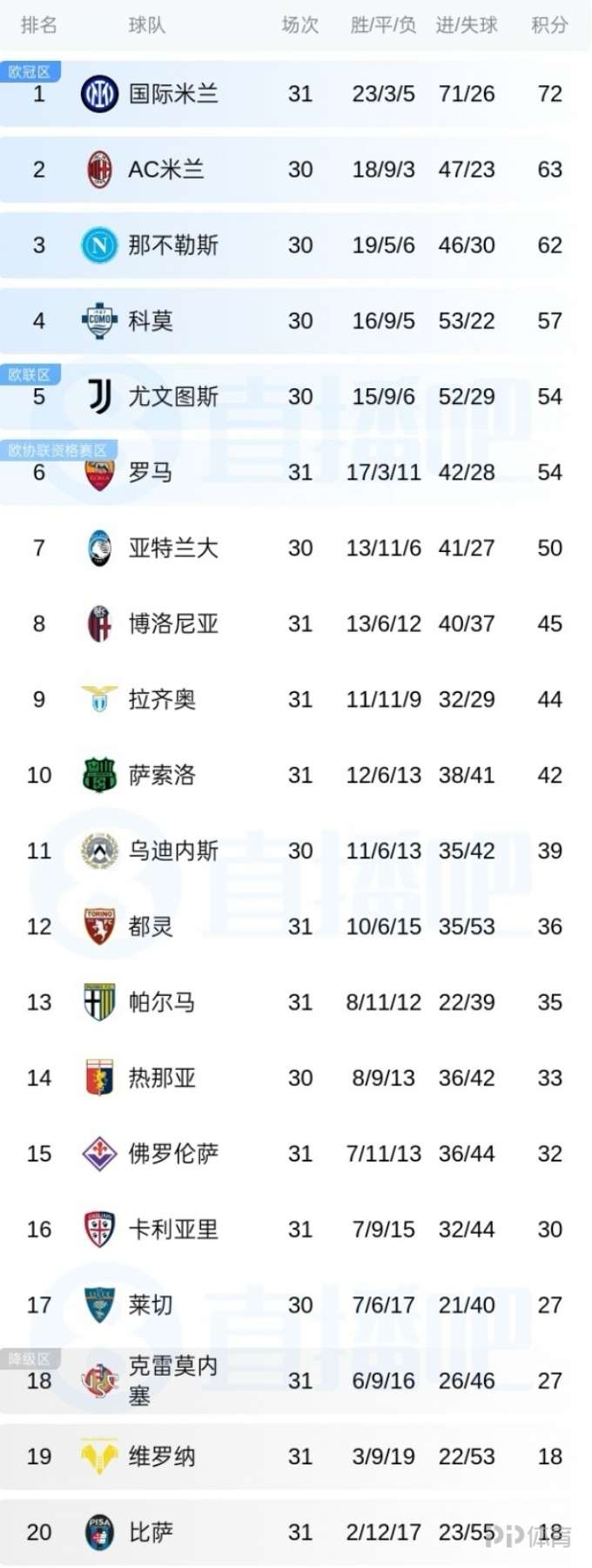 意甲第31轮,国米5-2轻取罗马,终结连胜3轮不胜,先赛9分领跑。罗马先赛仍54分,距离欧冠区3分。最新意甲积分榜如下: