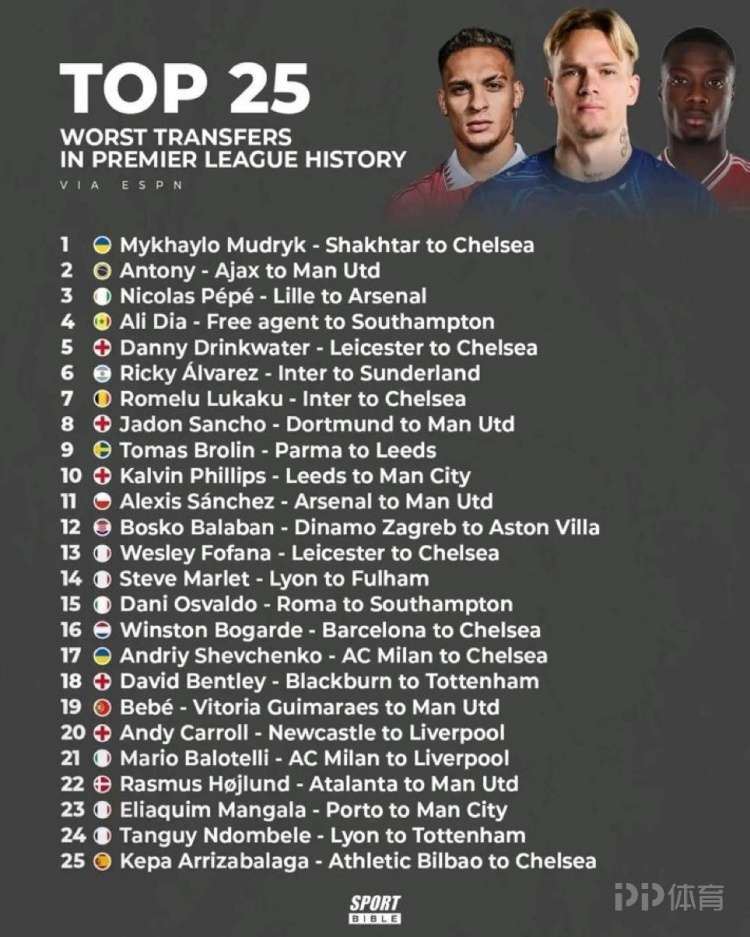 ESPN评选出了英超历史最糟糕的25笔转会,以下为具体排名情况: