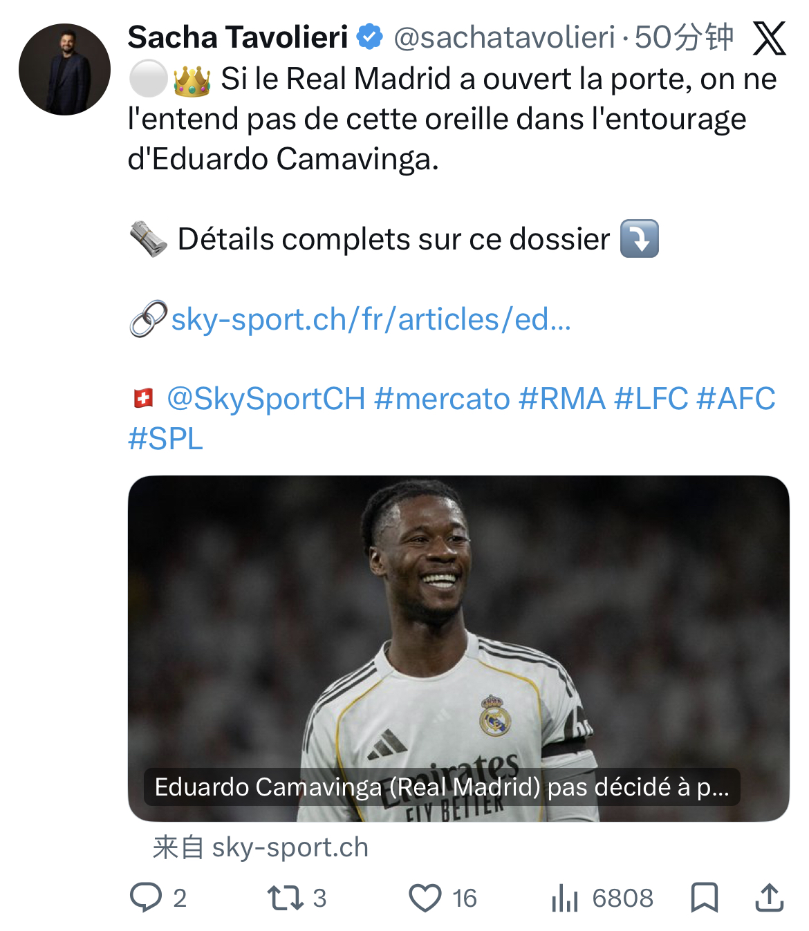 在个人社交媒体上,Sacha表示卡马文加的经纪公司CAA Stellar已经联系了阿森纳和利物浦方面,两支英超球队对他的多面手属性非常感兴趣。