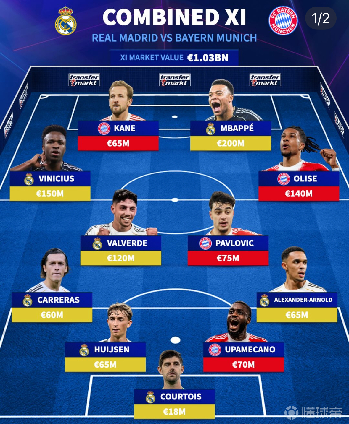 皇家马德里和拜仁慕尼黑的联合阵容(按身价排名):