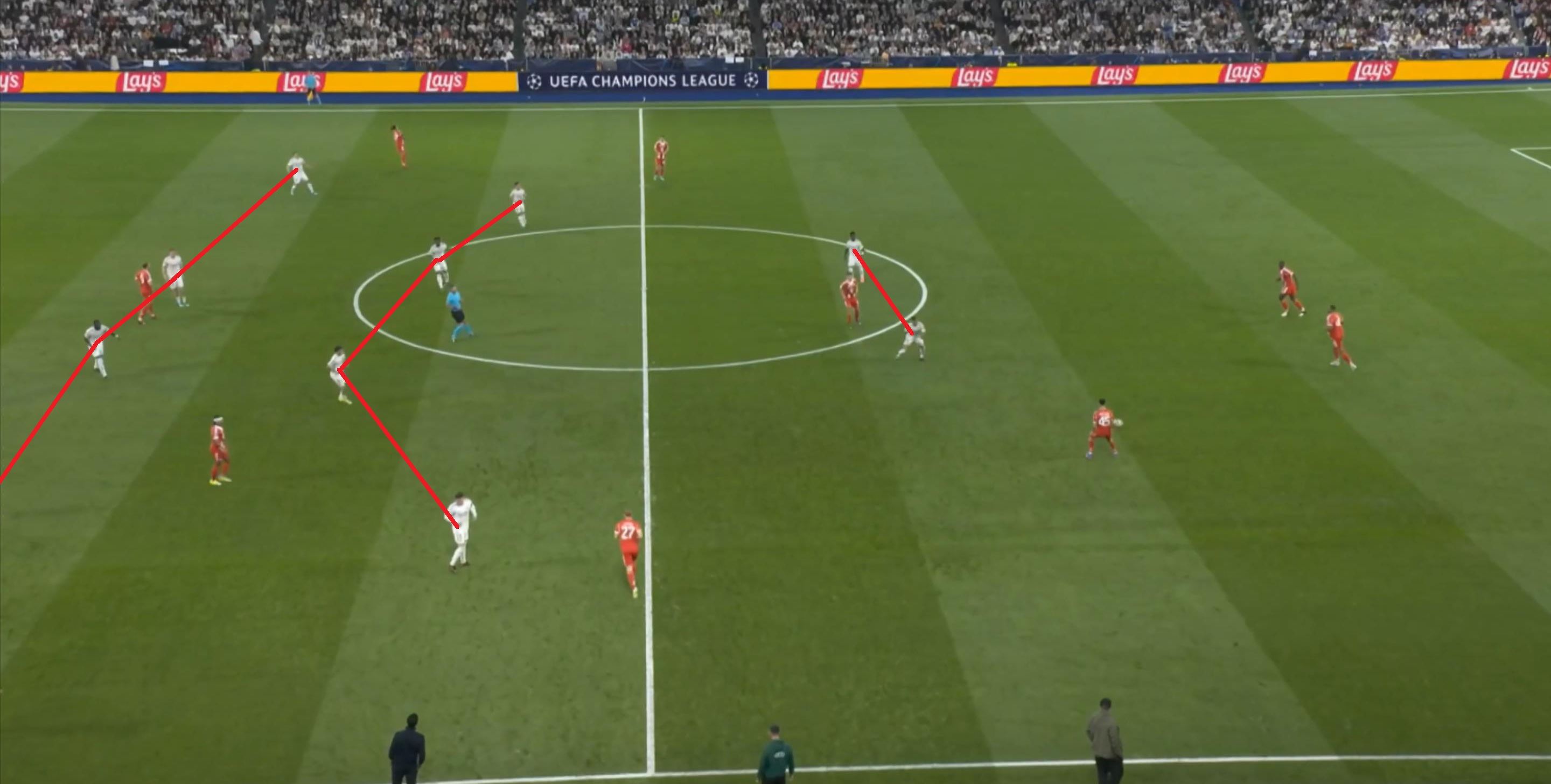 从这个角度来说,皇马已经展现出了他们的战术思路,打反击就是主轴,但这个主轴应该是零星出现的间奏才对,除此之外的大部分时间,他们其实都要处于无球的状态当中,而且要经受住拜仁的进攻。