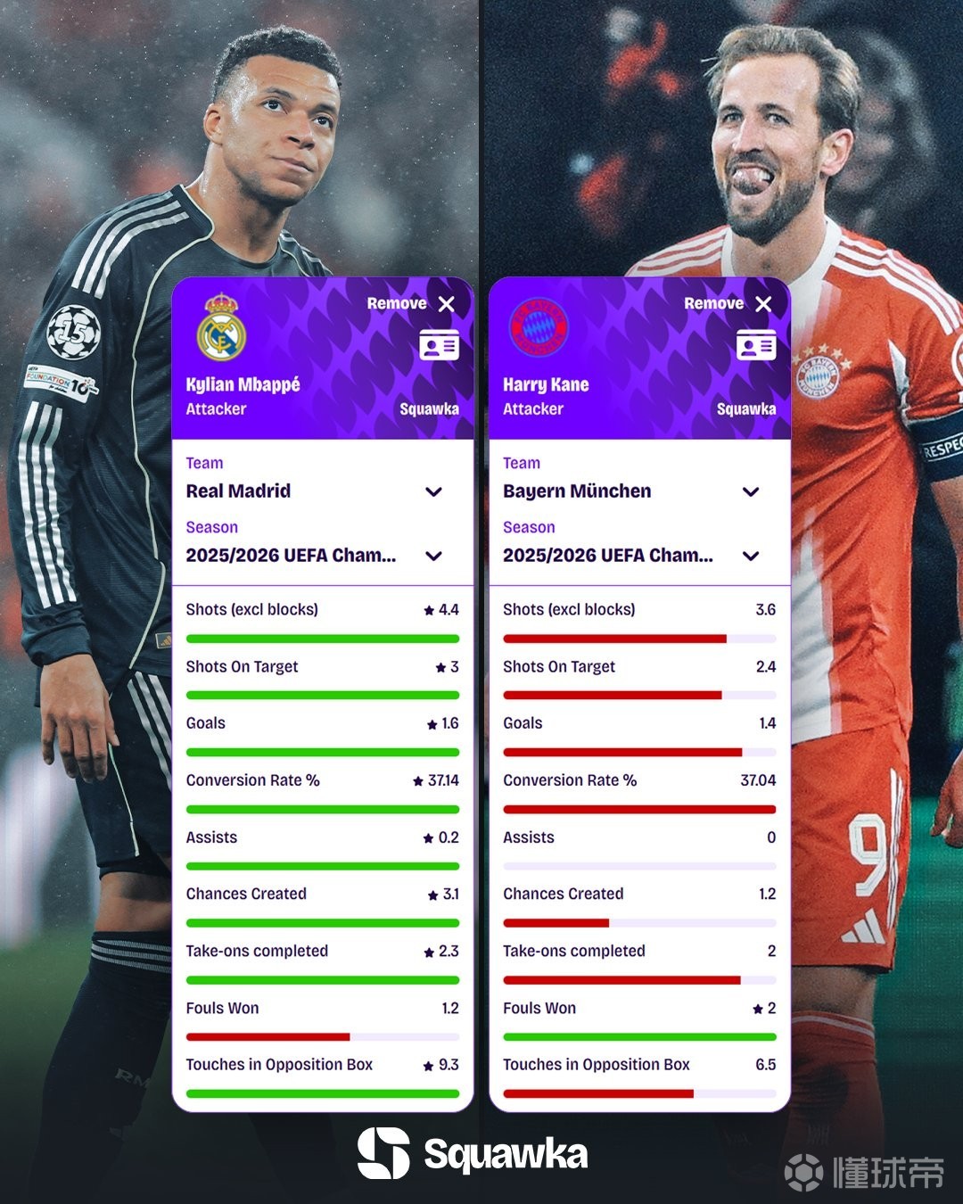 北京时间4月7日,欧冠1/4决赛首回合皇马主场迎战拜仁赛前,Squawka统计了姆巴佩、凯恩欧冠每90分钟数据对比。其中双方射正3-2.4,进球1.6-1.4,姆巴佩在多项数据均领先凯恩。