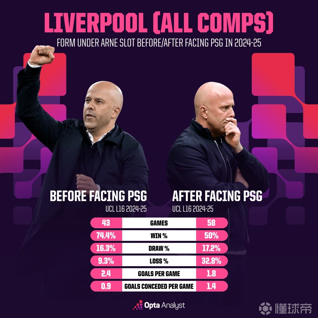 据统计,在上赛季欧冠16强战对阵巴黎之前,斯洛特在执教利物浦的前43场比赛中赢下32场(胜率74.4%),战平7场(16.3%),只输过4场(9.3%)。
