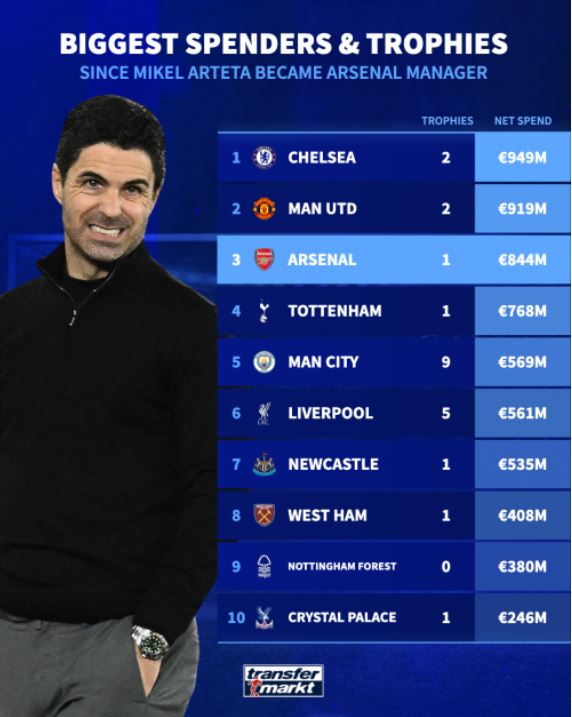 从2020年1月到现在花了近10亿欧元买人,阿尔特塔手里只有一个冠军(2019/20赛季足总杯)。这不仅落后于切尔西和曼联,跟利物浦(5个)和曼城(9个)更是没法比。