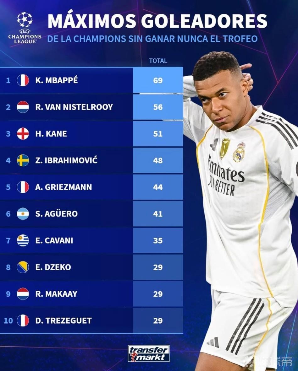北京时间4月8日,德转列出了从未赢得欧冠冠军的球员在该项赛事中的射手榜前10位,姆巴佩以69球高居第一,范尼斯特鲁伊56球第二,哈里-凯恩51球第三,伊布拉希莫维奇和格列兹曼上榜。