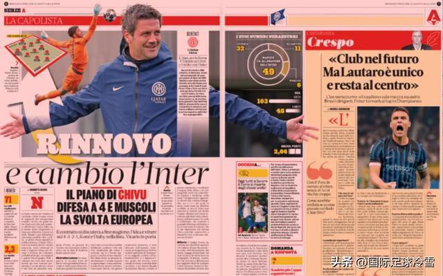 粉红报纸更是指出,国米希望通过出售球员,将夏季投资预算提升到1亿欧元的级别,并由此开始讨论国米彻底变阵4321,接轨欧洲主流的四后卫体系的事情。
