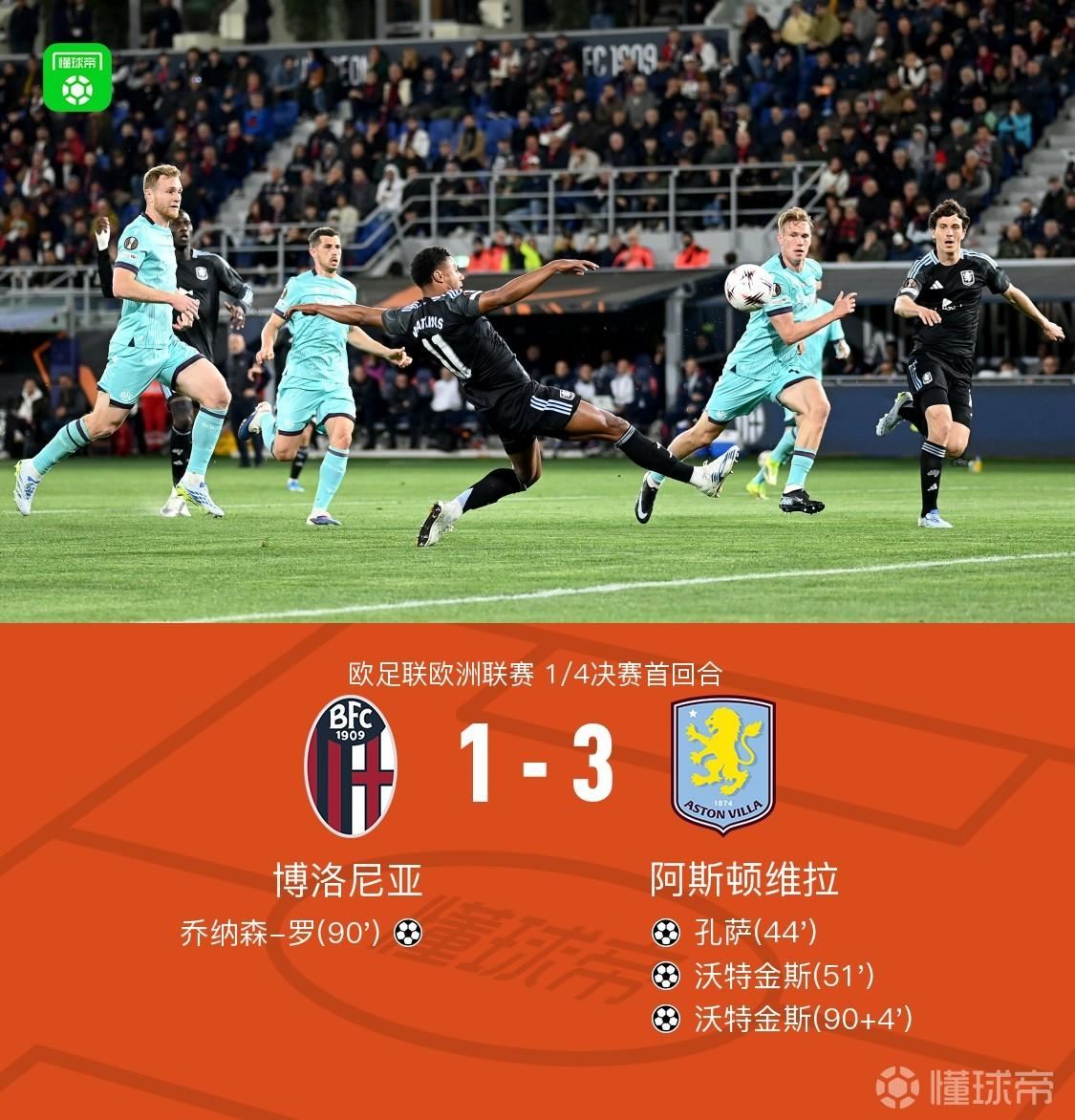 北京时间4月10日欧足联欧洲联赛 1/4决赛首回合,博洛尼亚对阵阿斯顿维拉。上半场孔萨首开记录,下半场沃特金斯破门扩大比分,90分钟乔纳森-罗扳回一球,随后沃特金斯破门梅开二度。最终比分博洛尼亚 1-3 阿斯顿维拉。