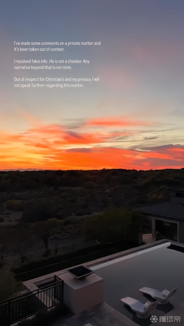 亚历克萨-梅尔顿表示:“我之前就一件私事说过一些话,但后来被断章取义了。我当时得到的是错误信息,他没有出轨。除此之外的任何说法,都不是我的意思。出于对克里斯蒂安和我个人隐私的尊重,关于这件事我不会再作更多回应。”
