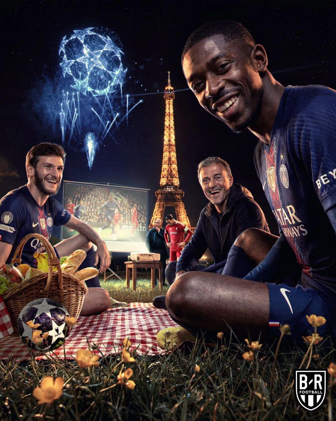 赛前大巴黎球迷展示巨大横幅,图案是身穿大巴黎球衣的绿巨人手撕利物浦队徽。球场上维蒂尼亚和三叉戟克瓦拉茨赫利亚、登贝莱、杜埃,也的确将利物浦防线撕得粉碎。大巴黎不仅欧冠淘汰赛7胜1平8场不败追平法甲球队纪录,还是1996年的南特(2比0莫斯科斯巴达克)以来,首支在欧冠1/4决赛零封国外球队的法国球队。