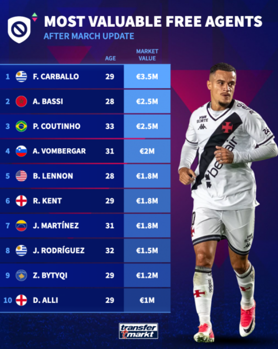四月份德国《转会市场》的最新身价更新,重新盘点了全球足坛最有价值的自由球员,让大家看到在这个阶段还能免签哪些球星。