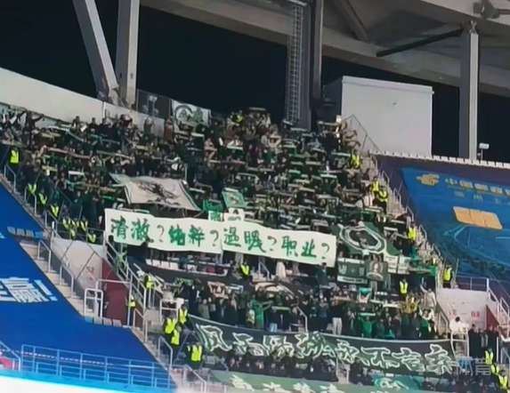 中超第5轮,大连英博3-0浙江。来到客场的浙江球迷在看台上拉起横幅,上面用白底绿字写道“清澈?纯粹?温暖?职业?”。